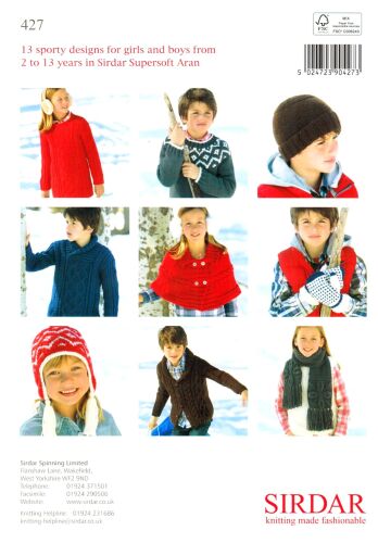 Sirdar Supersoft Snow Patrol Knitting Patterns Book 427 has gorgeous designs created in supersoft aran yarn, for childrens autumn/winter knitwear. There are patterns for boys and girls, to fit from age 2 to 13 years. The designs include cabled cardigans, leaf stitch scarf, classic cable knit sweaters, Nordic style helmet, pull on hat, mittens, girl's snow cape, poncho with chic tassells, for staying warm and cosy on crisp, autumn/winter days and nights. Ideal for wearing whilst out in the snow! The booklet offers excellent value for money because it incorporates pattern leaflets 2360 poncho with/without fringe, 2361 sweater, sweater dress, 2362 icelandic style polo neck, round neck sweater, 2363 v-neck cardigan, cardigan with collar, 2364 cable pattern cape, 2365 pull on hat, Nordic helmet, mittens and scarf. Recommended knitting needles sizes 4mm/5mm. Yarn requirements will vary according to sizing requirements and individual knitters tension. As with all of our pattern booklets, this item is not returnable